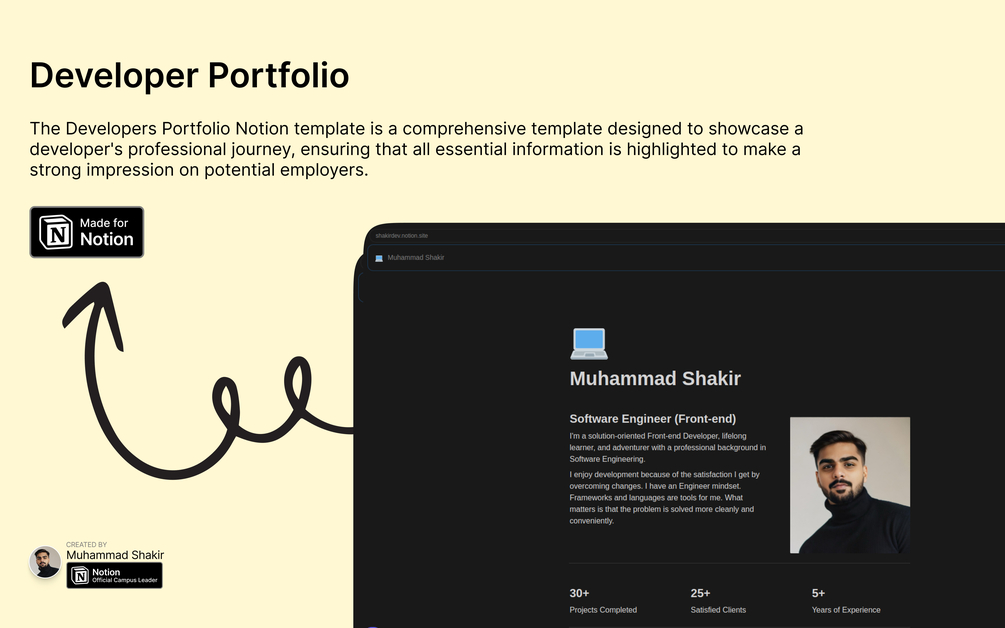 The Developers Portfolio Notion template is a comprehensive template designed to showcase a developer's professional journey, ensuring that all essential information is highlighted to make a strong impression on potential employers. This template includes sections meticulously crafted to present a well-rounded profile that stands out in the competitive job market.